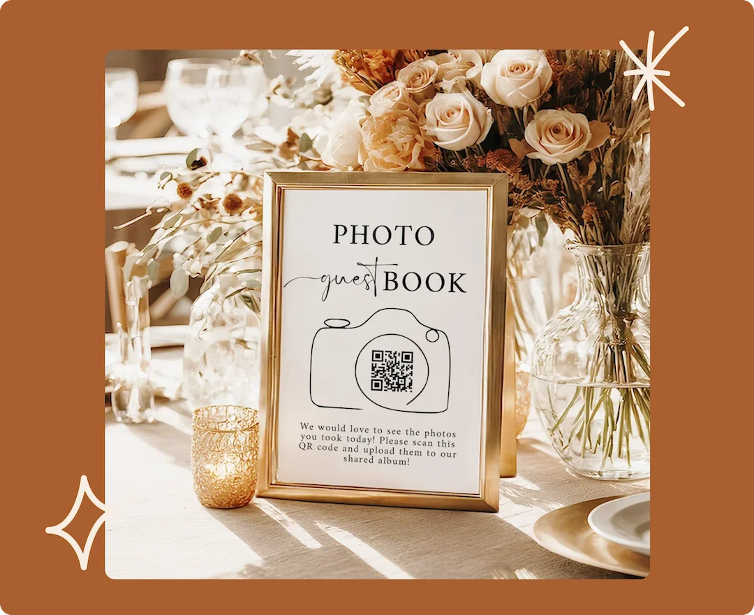 Vos invités peuvent facilement voir ou ajouter des photos et vidéos à votre album numérique en scannant le QR code unique ou en utilisant l’URL de l’album – avant, pendant et après votre événement !